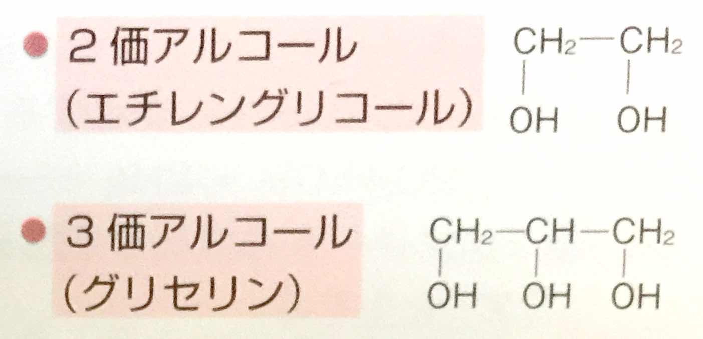 *「図のように,「2価アルコール」には,「エチレングリコール」,「3価アルコール」には,「グリセリン」などがあります。」
