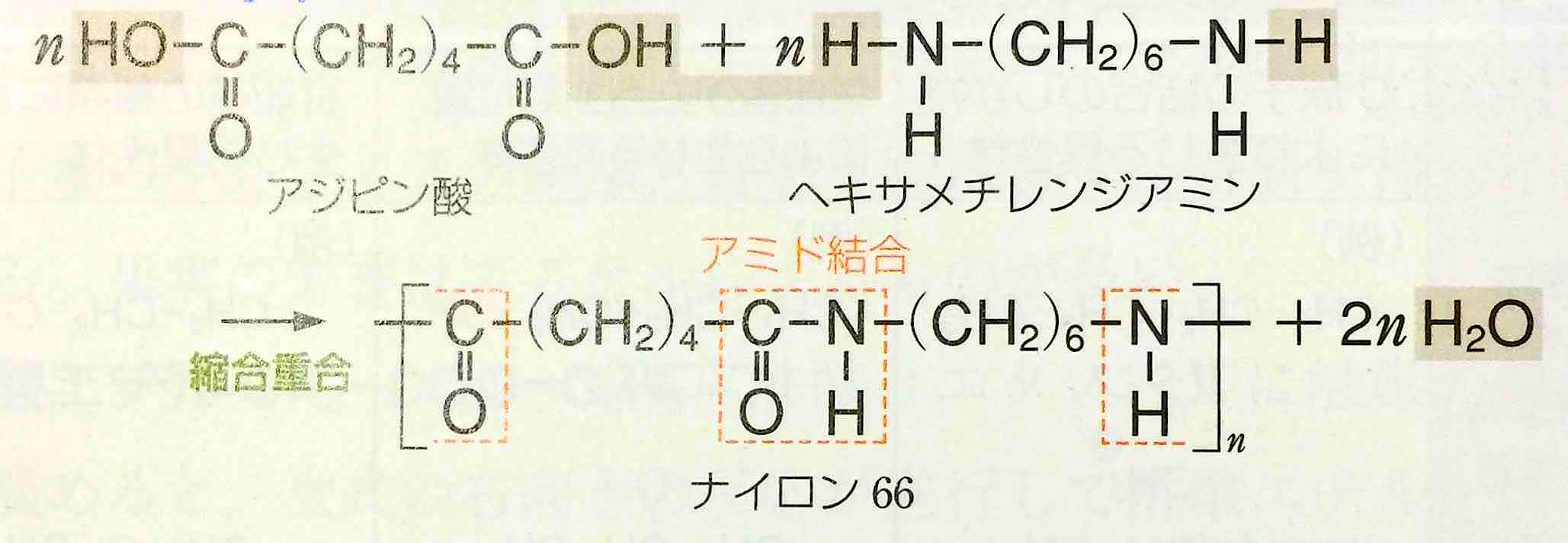 *「上の図のように,アジピン酸とヘキサメチレンジアミンのアミド結合を生む反応が,次々と連続して起こると「ナイロン66」が生成します。この反応を「縮合重合」といいます。」