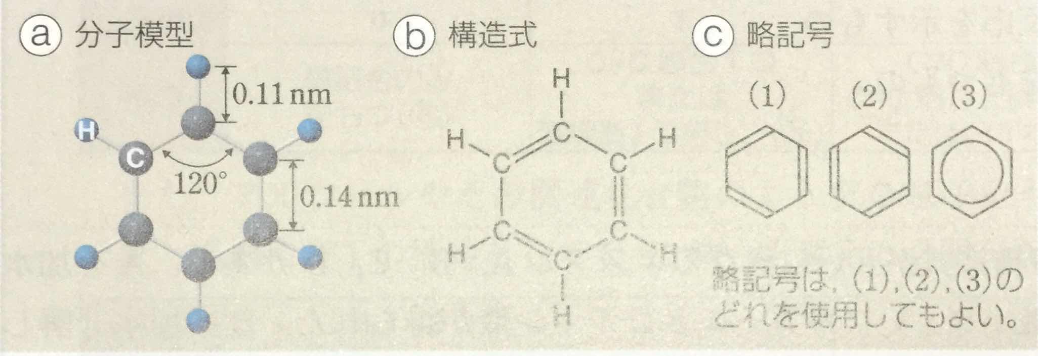 *「上の図の(c)が略記号です。(a):分子模型,(b):構造式も参考にして下さい。」