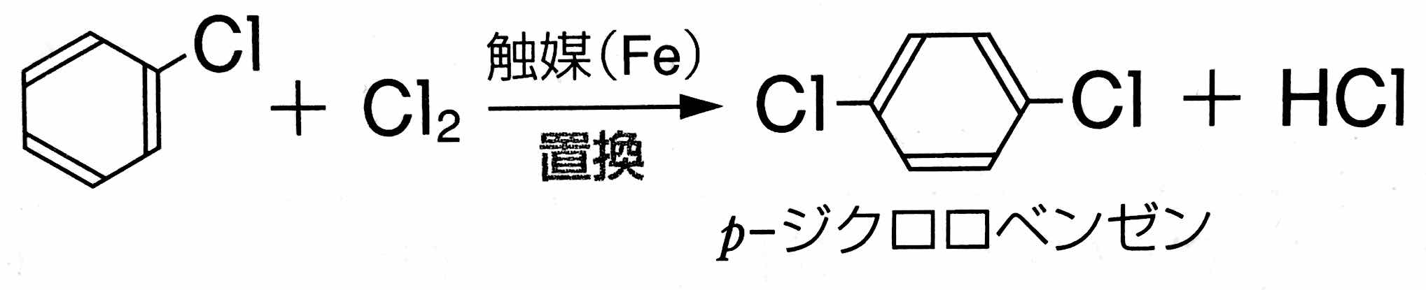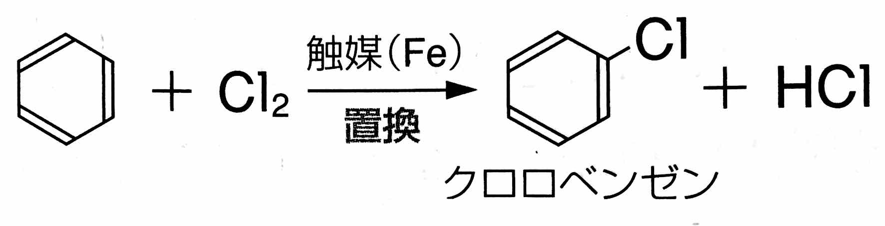 *「ベンゼンに鉄粉,または塩化鉄(Ⅲ) を触媒として塩素を反応させると生じる化合物は「クロロベンゼン」です。次のように反応します。」
