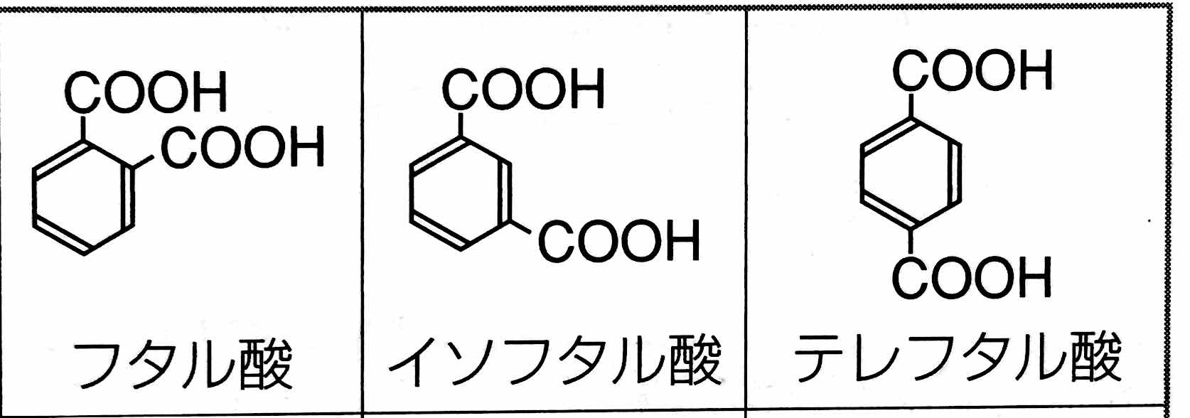 *「ベンゼン環に2個のカルボキシ基(-COOH) が結合した構造の「ジカルボン酸」には,下の図のように,フタル酸,イソフタル酸,テレフタル酸,の3種類の異性体があります。」
