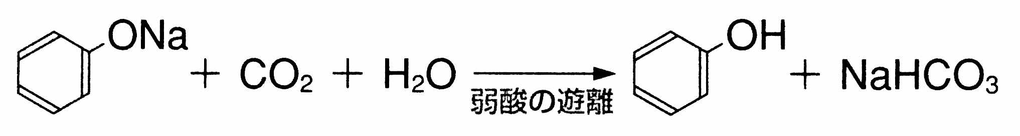 *「フェノールは炭酸よりも弱い酸なので,ナトリウムフェノキシドの水溶液に二酸化炭素を通じると,弱酸遊離反応が起きてフェノールが遊離します。」