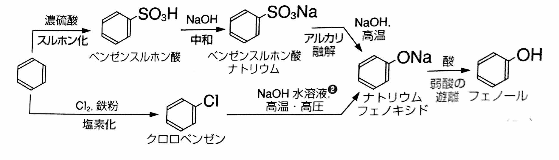 *「従来のフェノールの製法は,「アルカリ融解法」,「クロロベンゼン法」という下の図のような行程で作られていました。」