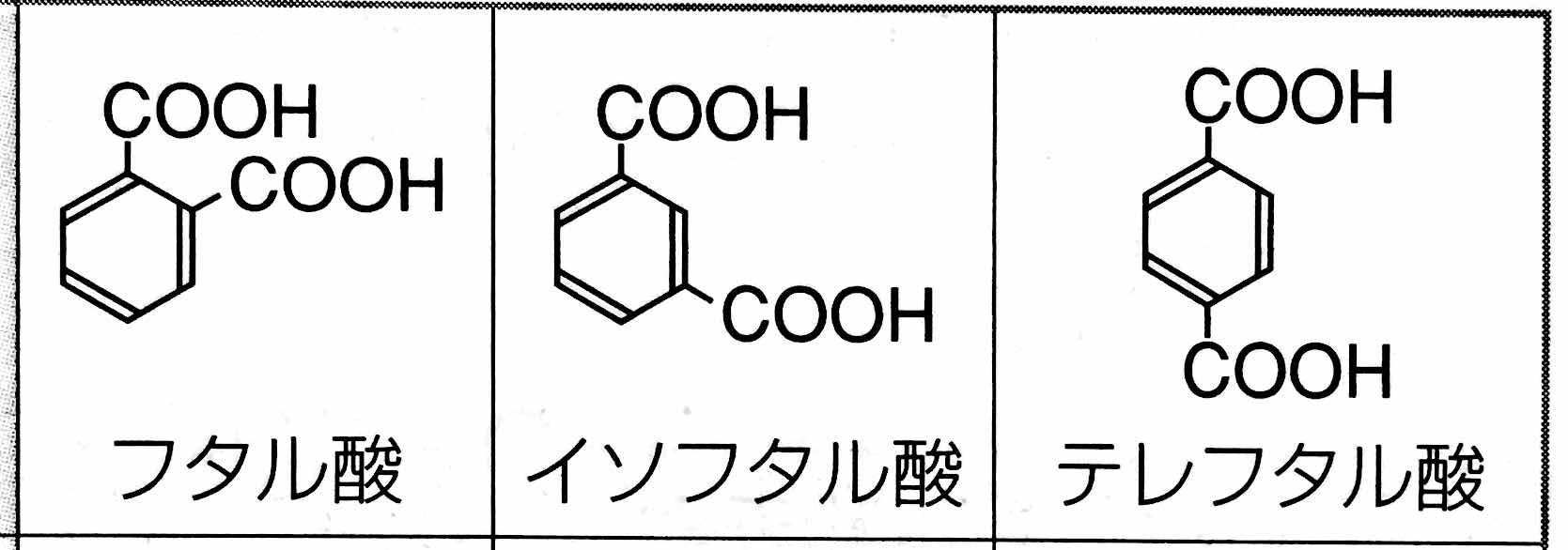*「ベンゼン環に2個のカルボキシ基:-COOH が結合した構造のジカルボン酸には,フタル酸,イソフタル酸,テレフタル酸の3種類の異性体があります。(次の図)これらはいずれも白色の固体です。 」
