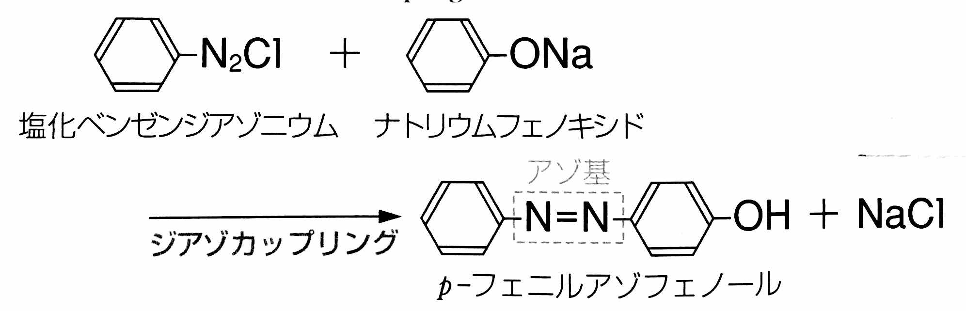 *「塩化ベンゼンジアゾニウム水溶液にナトリウムフェノキシド水溶液を加えると,赤褐色の「p-ヒドロキシアゾベンゼン」が生じます。」