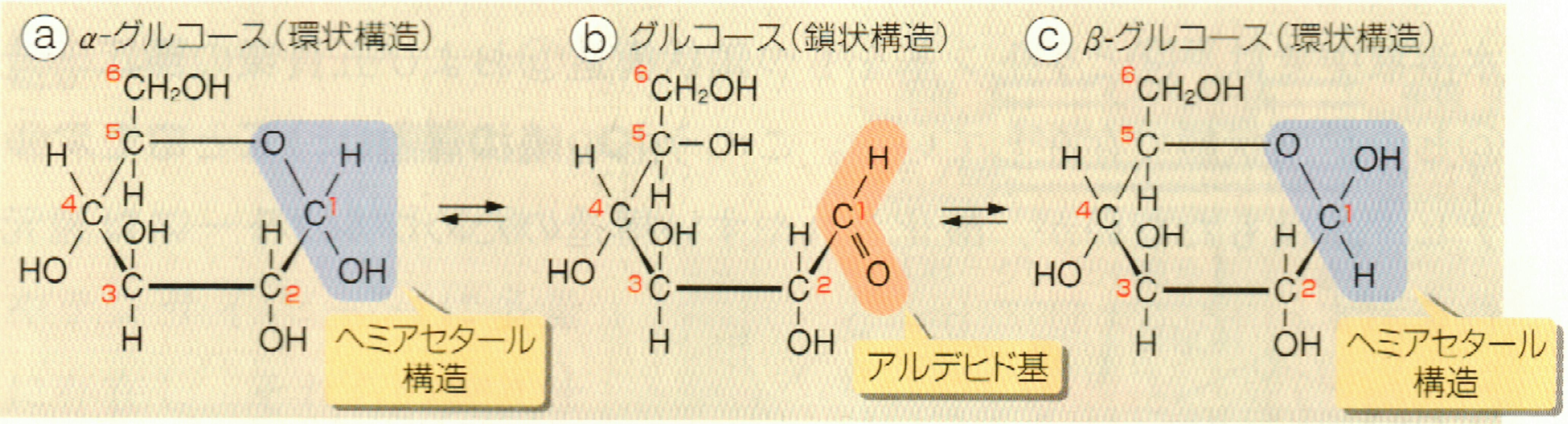 *「上の図のように,グルコースの水溶液中の異性体には,α,β,鎖状構造,の3つがあります。」