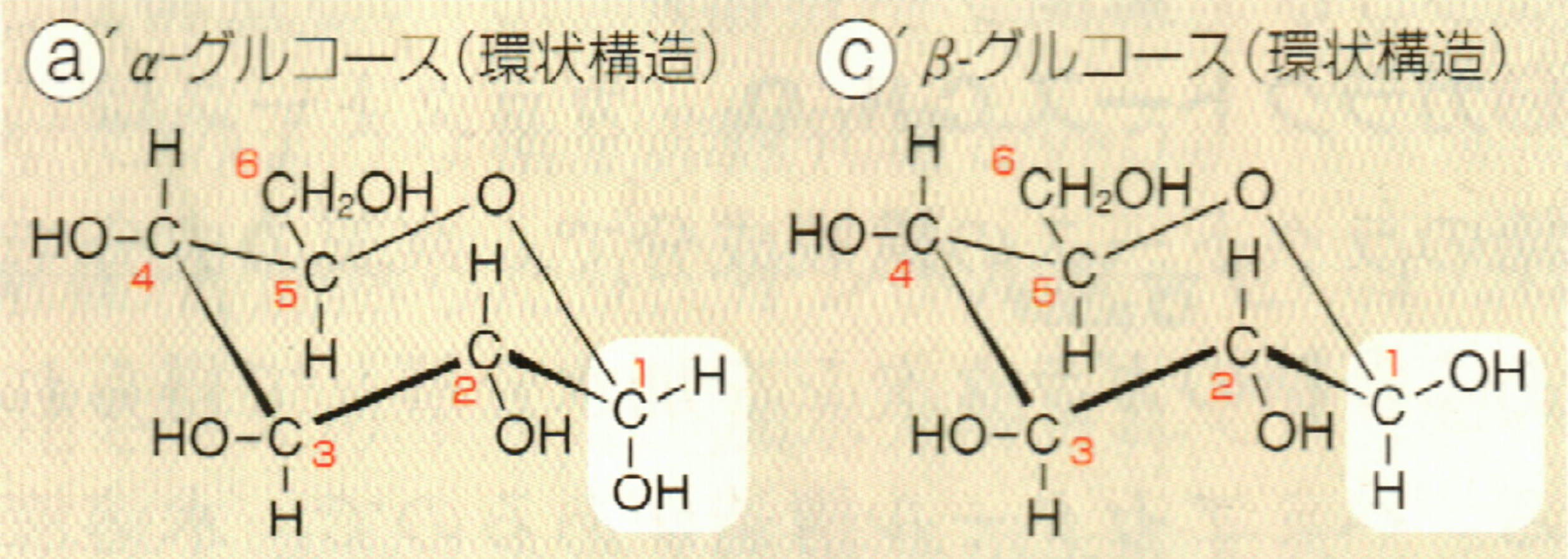 *「結晶中のグルコース分子は,原子6個でできた環状構造をとり,「α-グルコース」と「β-グルコース」の2種類の「立体異性体」があります。」