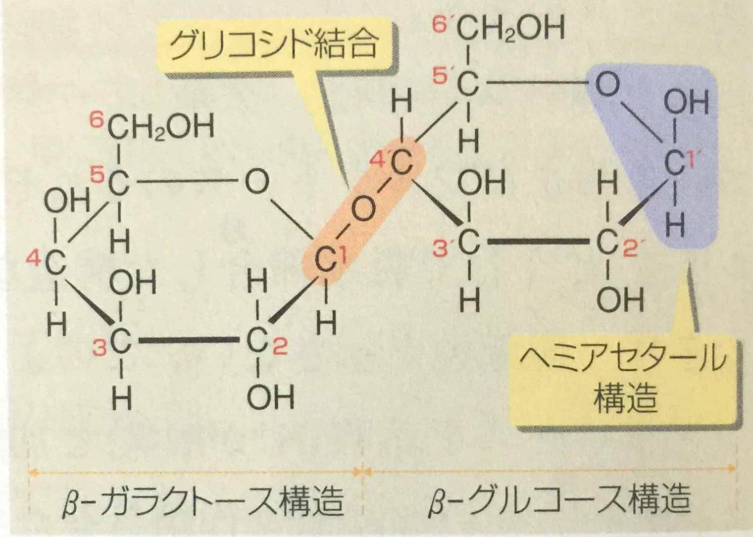 *「ラクトースは,乳糖と呼ばれ,それほど甘くありません。ほ乳類の乳汁中に含まれます。希酸または「酵素・ラクターゼ」により加水分解され,ガラクトースとグルコースが生成します。」