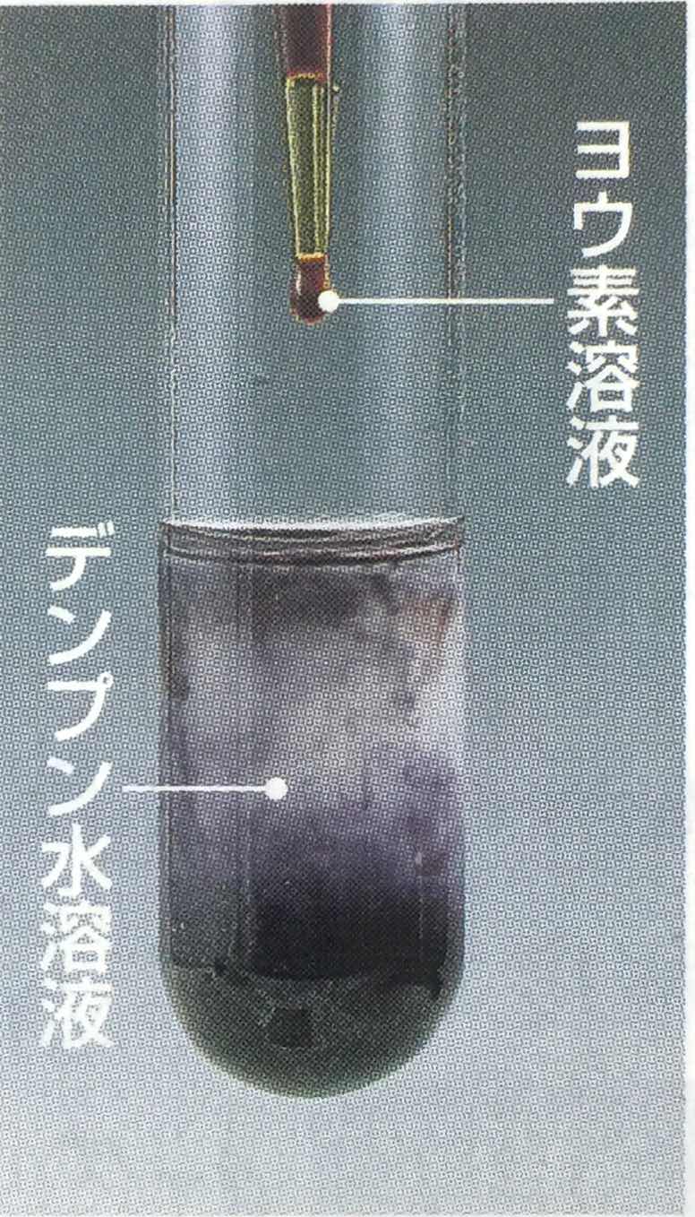 *「デンプン水溶液に,ヨウ素溶液を加えると,「青紫色(青色)」を示します。」
