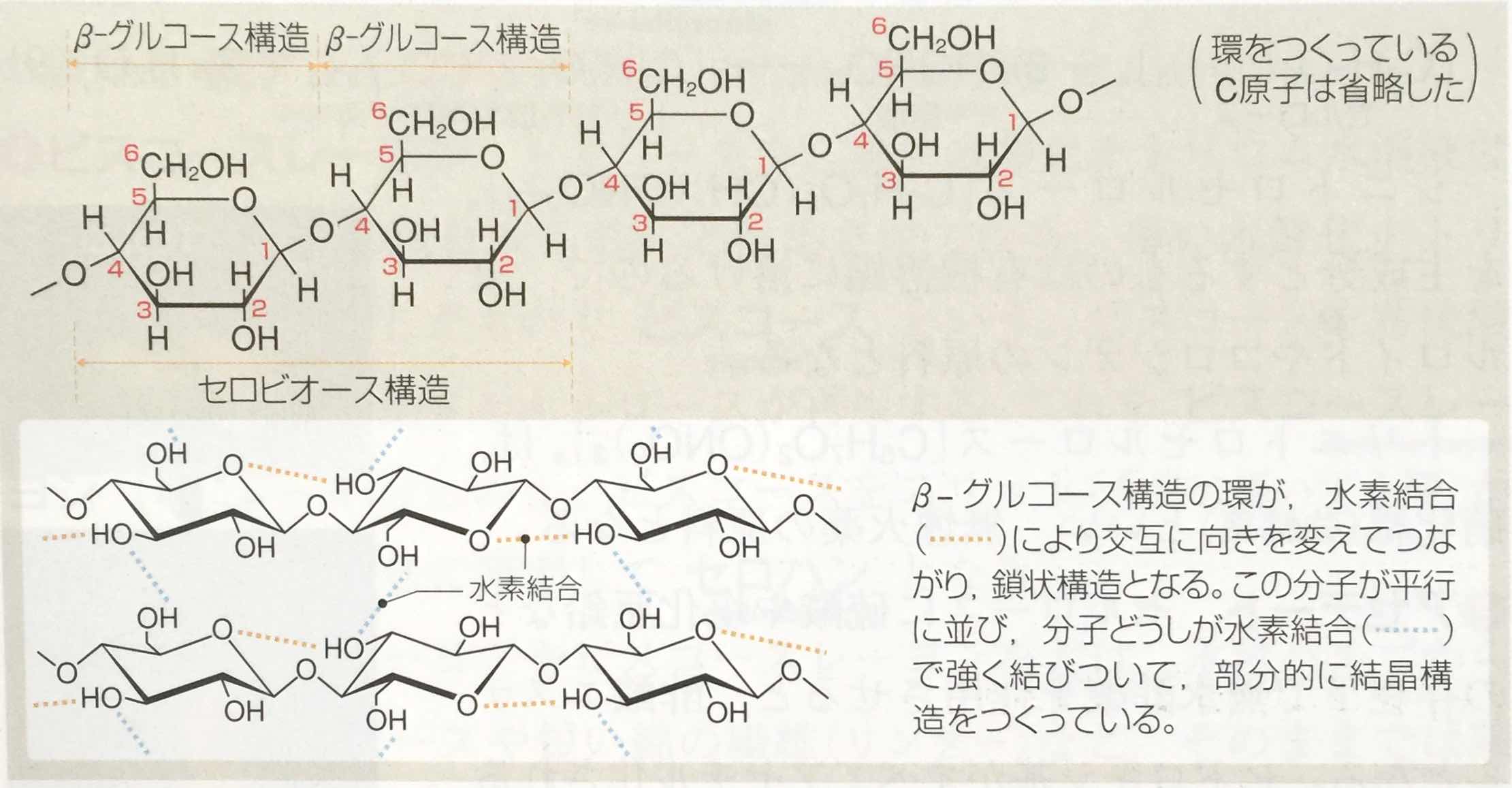 *「セルロース分子は,「β-グルコース分子」が直鎖状に繰り返した構造をしており,分子量は百万〜数千万にもなります。」