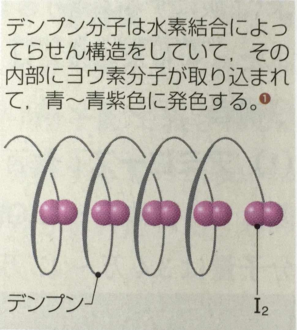 *「デンプンは下の図のようにらせん構造をしていて,ヨウ素をその中に取り込むので,ヨウ素デンプン反応が起こります。」