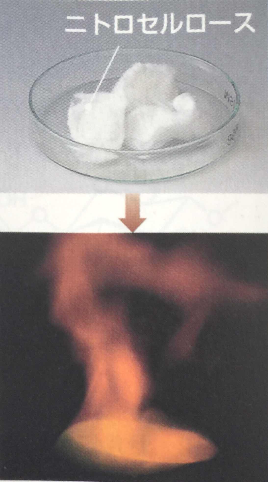 は,硝化綿(強綿薬)といい,無煙火薬の原料となります。次の写真のように点火すると瞬時に燃えます。(手品でよく使われますね)」