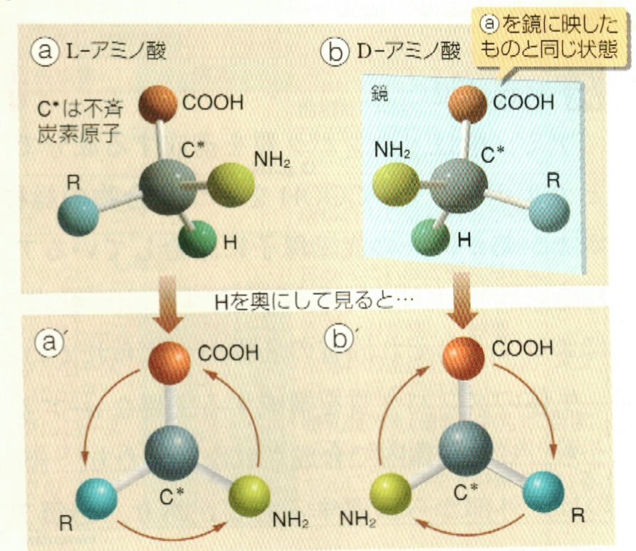*「ほとんどの α-アミノ酸 は不斉炭素原子をもつので,「鏡像異性体(光学異性体)」た存在します。」