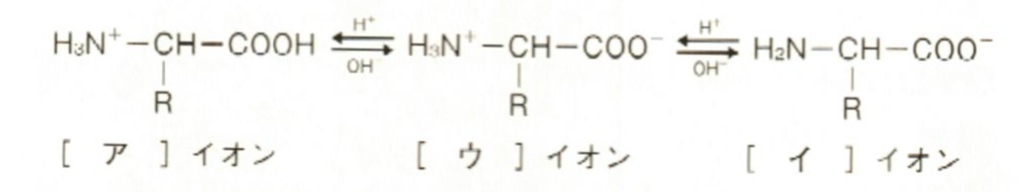*「上の図の様に,アミノ酸の水溶液を酸性にすると,( ① )イオン,塩基性にすると,( ② )イオン,その中間で( ③ )イオンになります。」