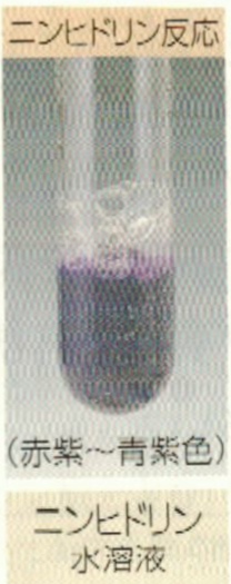 *「上の図の物質は「ニンヒドリン」です。タンパク質の水溶液に「ニンヒドリン溶液」を加えて加熱すると呈色する反応を「ニンヒドリン反応」といいます。」