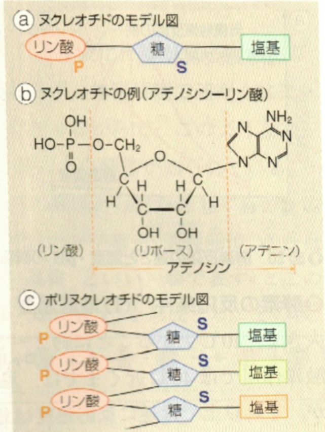 *「「核酸」は,遺伝子の本体で,遺伝情報をもちます。リン酸・糖(ペントース)・塩基 からなる「ヌクレオチド」と呼ばれる化合物が鎖状に集合した「ポリヌクレオチド」です。」